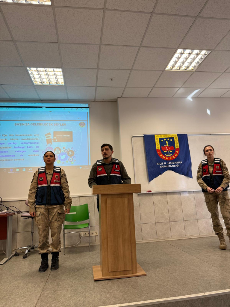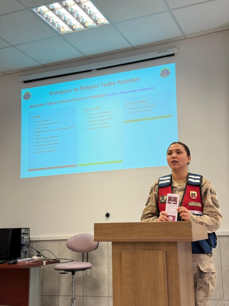 Program kapsamında J. Asb. Üçvş. Nursel Kurt ve J. Asb. Çvş. Ece Akgün tarafından aile içi şiddetle mücadele süreçleri, başvuru mekanizmaları ve koruyucu-önleyici hizmetler hakkında bilgilendirme yapıldı. J. Asb. Kd. Çvş. Ahmet Alim Yüksel tarafından gençlerin dijital ortamda karşılaşabileceği risklere dikkat çekilerek siber suçlar, dijital güvenlik ve güvenli internet kullanımı hakkında bilgiler paylaşıldı. Programda ayrıca J. Asb. Kd. Çvş. Osman Ayten tarafından narkotik suçlarla mücadele, bağımlılıkla mücadelede toplumsal farkındalık ve gençlerin korunmasına yönelik önleyici çalışmalar hakkında bilgilendirme gerçekleştirildi.